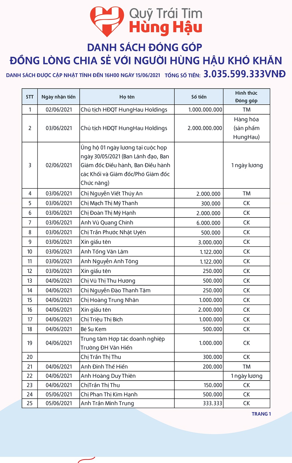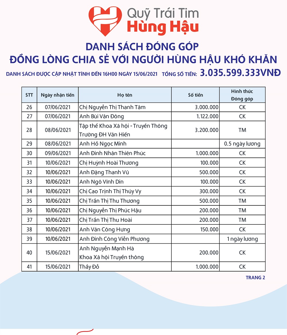Theo đó, tính đến 17h00 ngày 16/06/2021, Quỹ Trái tim Hùng Hậu đã nhận đóng góp giúp đỡ Người Hùng Hậu đang gặp khó khăn tổng số tiền là 3,035,599,333 đồng (danh sách đính kèm).