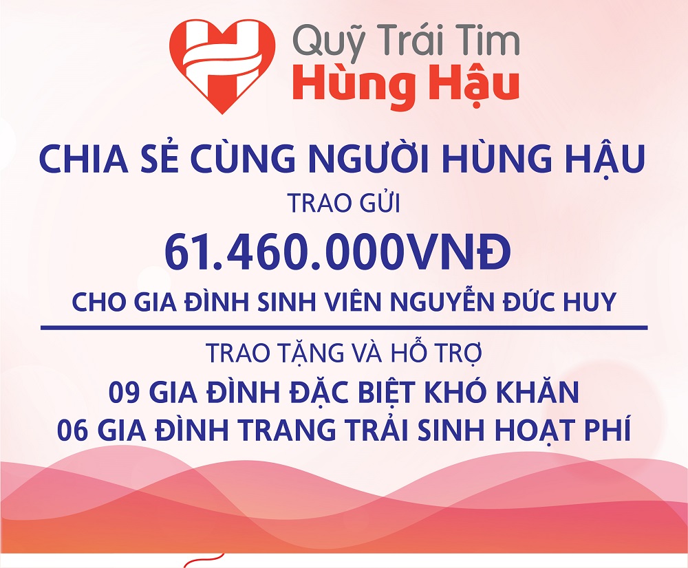Quỹ Trái tim Hùng Hậu xin gửi lời cảm ơn chân thành nhất đến Quý Mạnh Thường Quân; Quý Doanh nghiệp – Hệ sinh thái Hùng Hậu đã luôn quan tâm ủng hộ suốt thời gian qua. Hy vọng sẽ tiếp tục nhận được sự tin tưởng và chung tay đóng góp, cùng nhau đồng hành để nhanh chống hỗ trợ, tiếp sức những hoàn cảnh gặp khó khăn trong ngôi nhà Hùng Hậu.