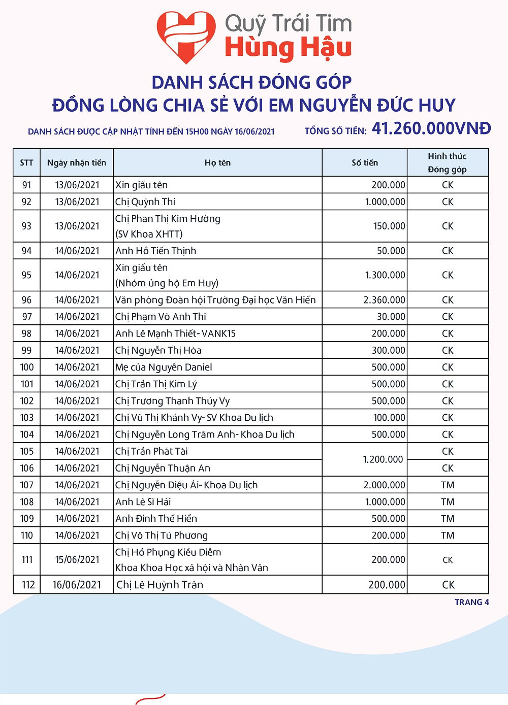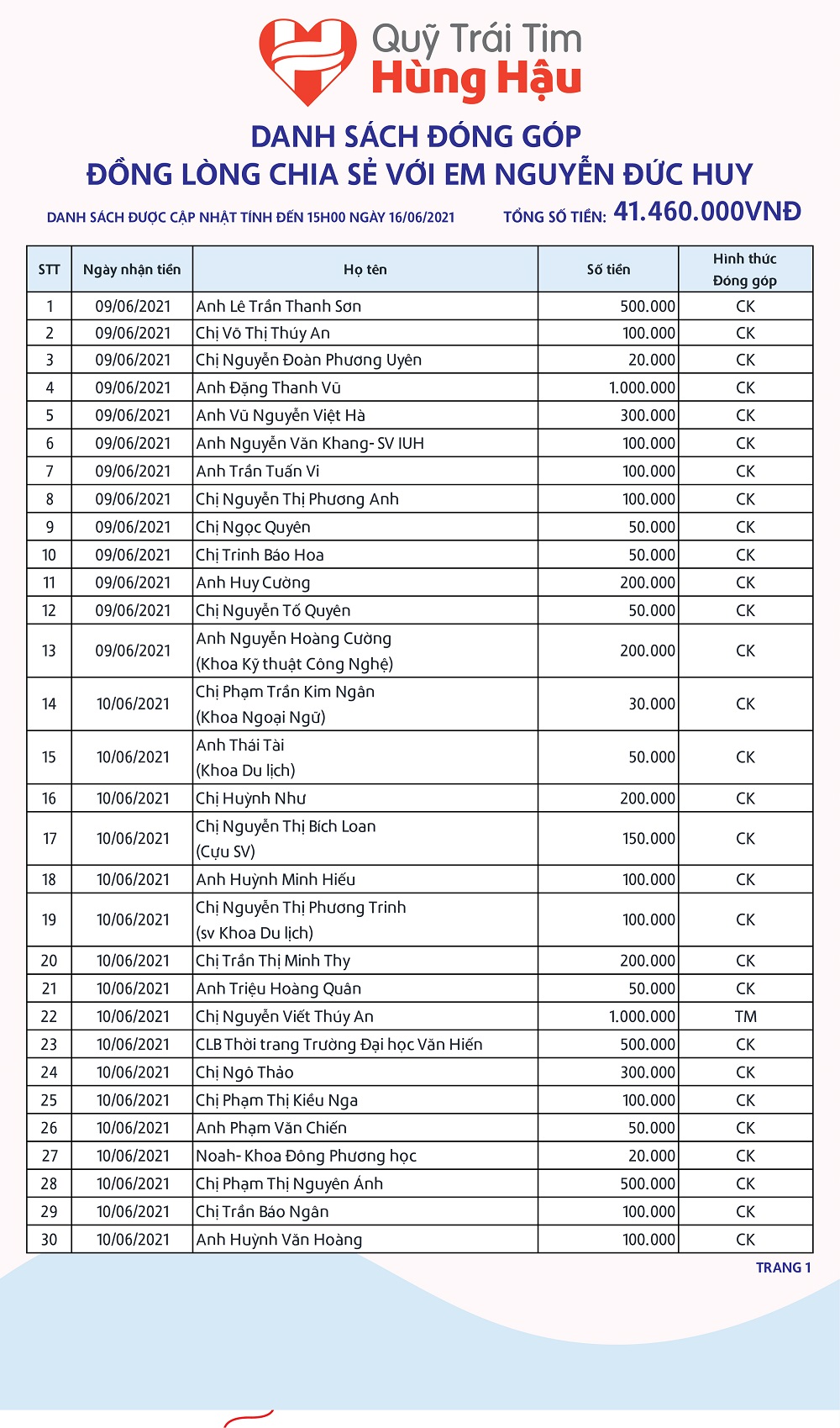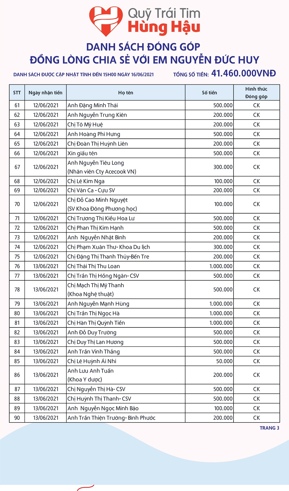 - Sáng ngày 17/06/2021 đã chuyển toàn bộ số tiền kêu gọi đóng góp những ngày qua cho Em Nguyễn Đức Huy, như vậy, tổng cộng 03 đợt chuyển khoản giúp đỡ là 61.460.000 đồng (trong đó trích nguồn của Quỹ là 20 triệu đồng và 41.460.000 đồng từ sự kêu gọi như danh sách đính kèm). Hiện tại sức khỏe của Em Huy đã thích nghi với phương án 1, tình trạng sức khỏe đang dần ổn định và phục hồi.
