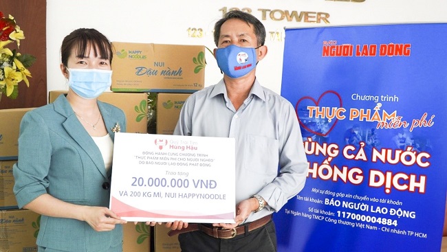 Chiều ngày 7/6/2021, Quỹ Trái tim Hùng Hậu và đại diện Trường ĐH Văn Hiến đã trao tặng 20 triệu đồng và 200kg mì, nui ủng hộ chương trình “Thực phẩm miễn phí cùng cả nước chống dịch” của Báo Người Lao động tổ chức.